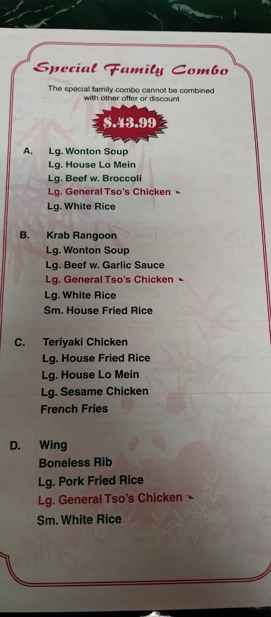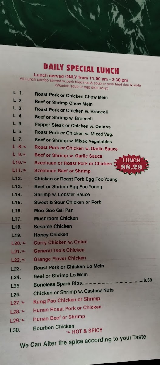 Whether you're stopping by for a quick lunch special or sharing a meal with family and friends, the menu’s balance of flavorful entrees and hearty sides like Pork Fried Rice and Chicken Chow Mein makes it easy to find something that suits your appetite. Items such as Honey Chicken Wings and Boneless Spare Ribs appeal to those craving a bit of indulgence, while combo meals provide convenient options to experience a variety of tastes in one sitting.